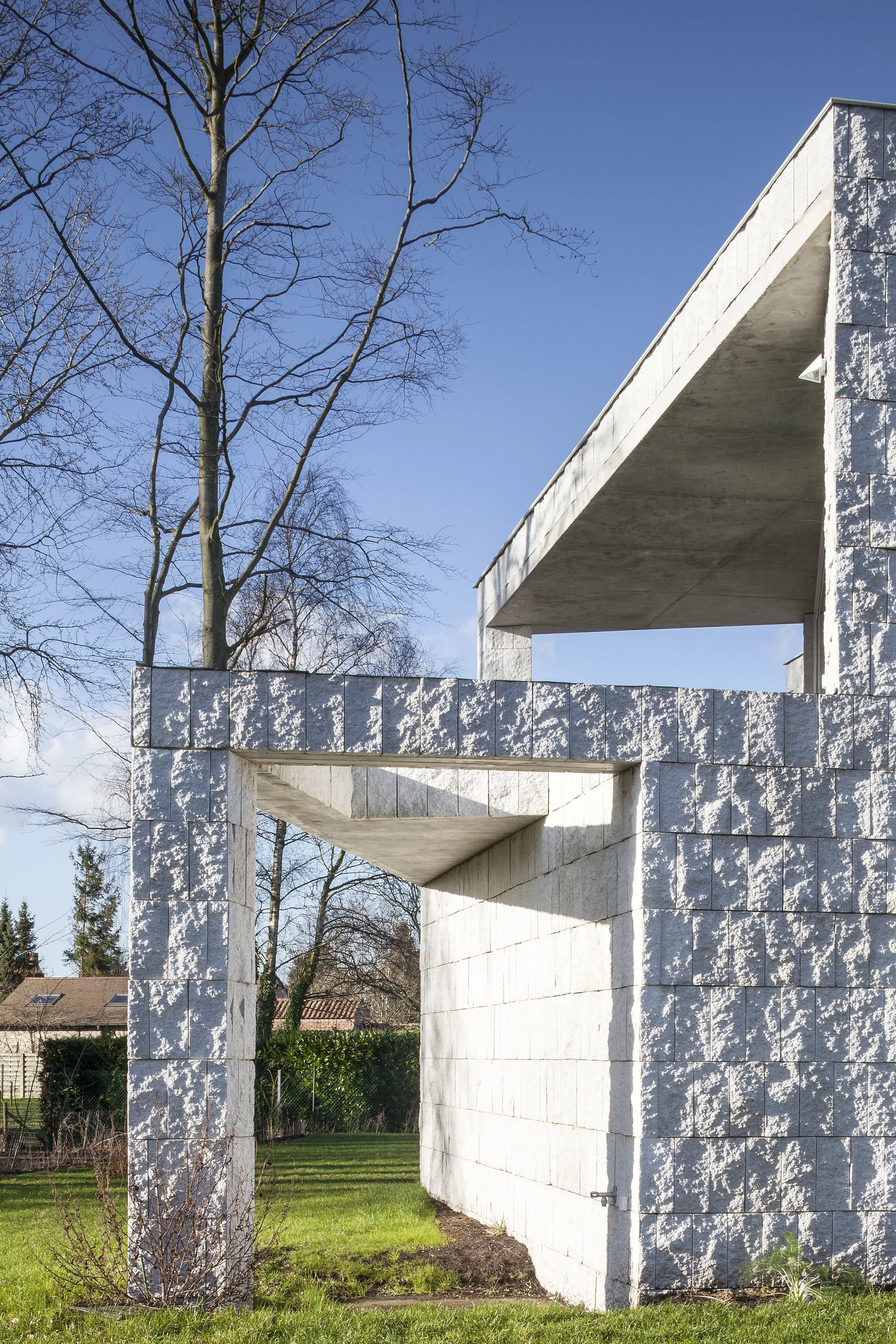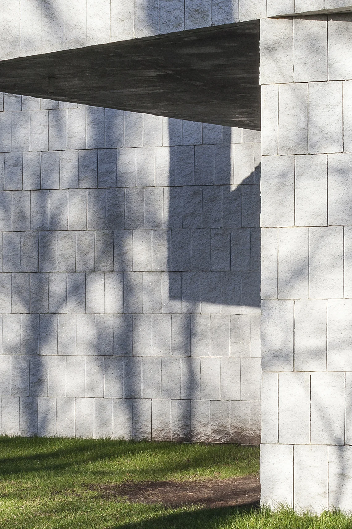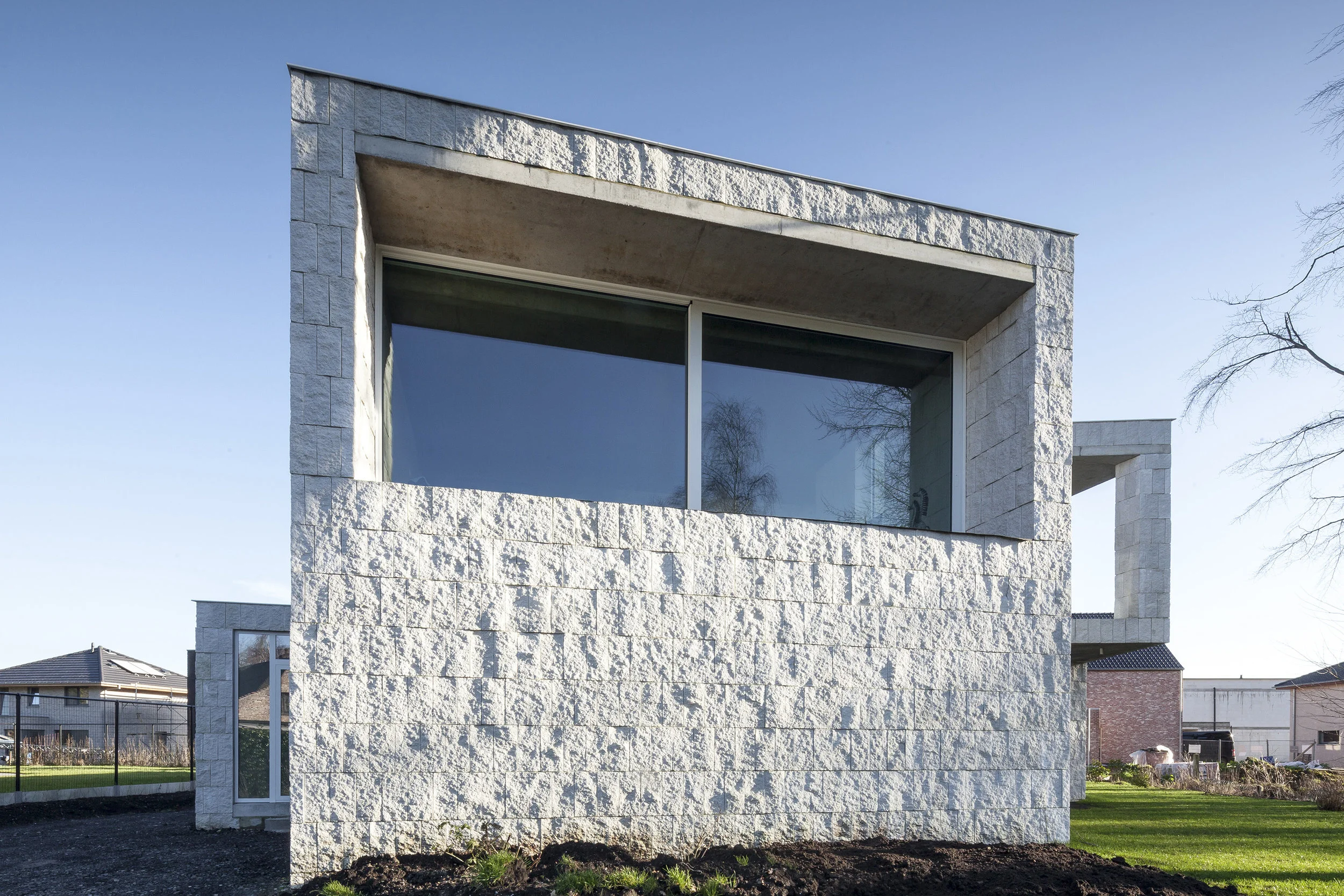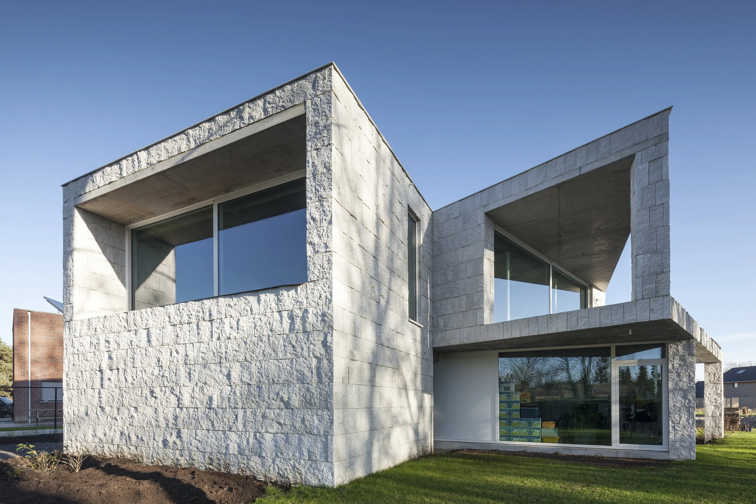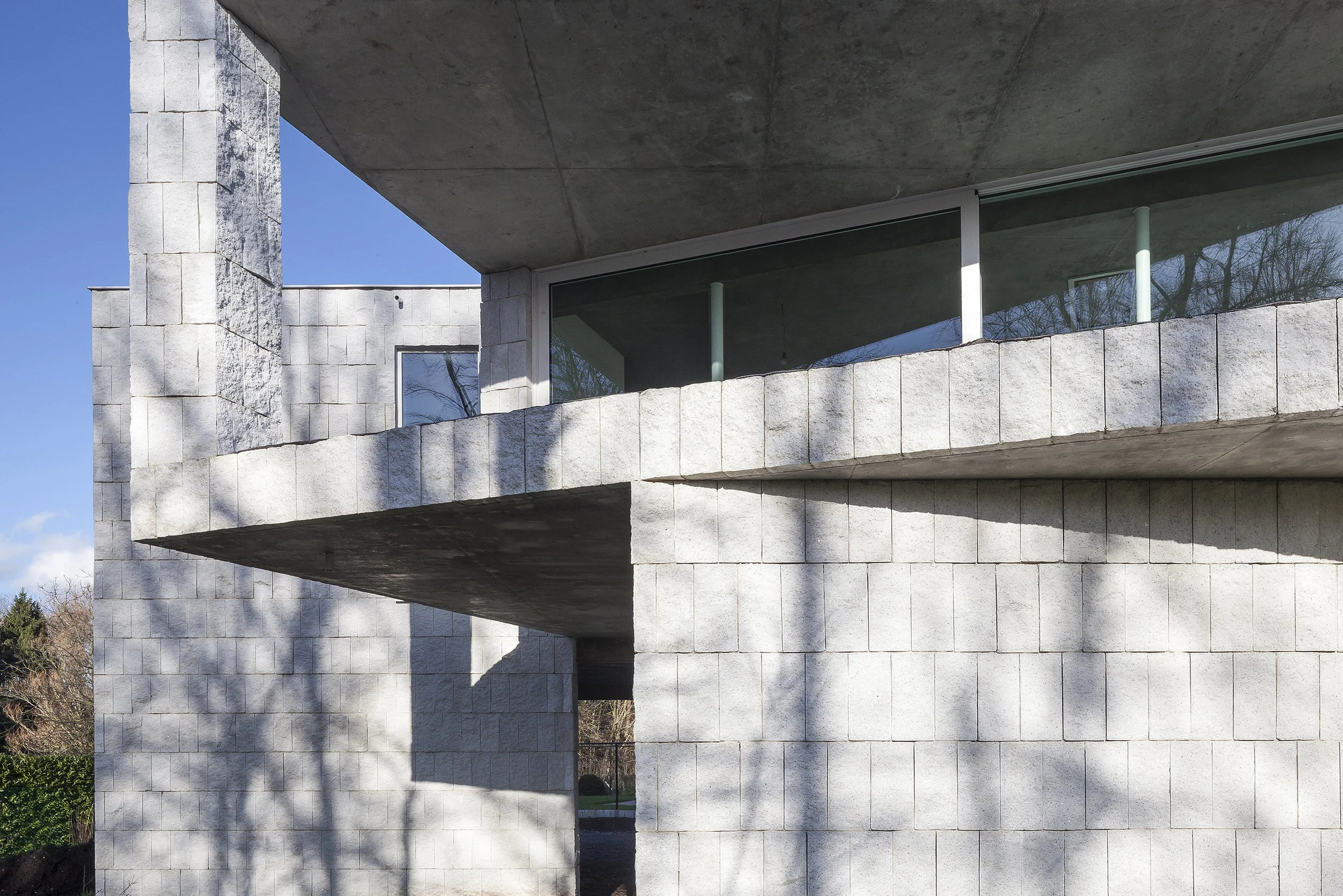 A large format cleaved concrete block was chosen as the façade material.