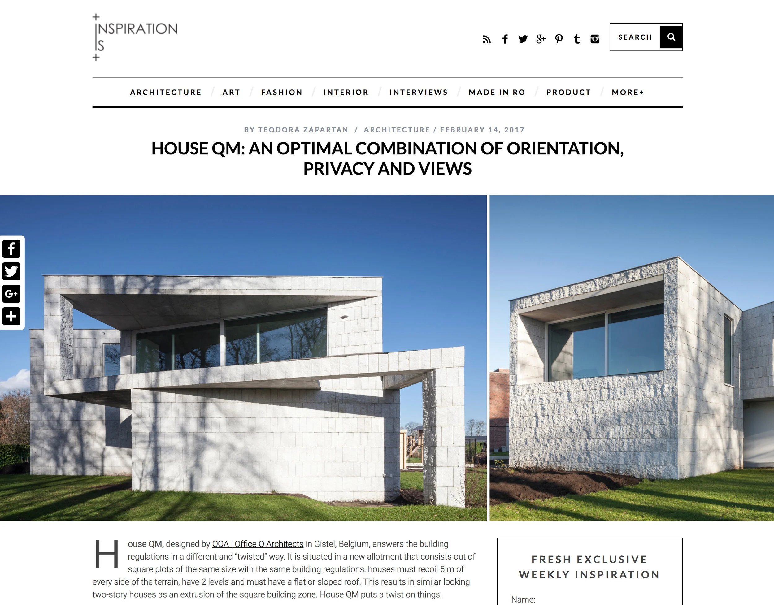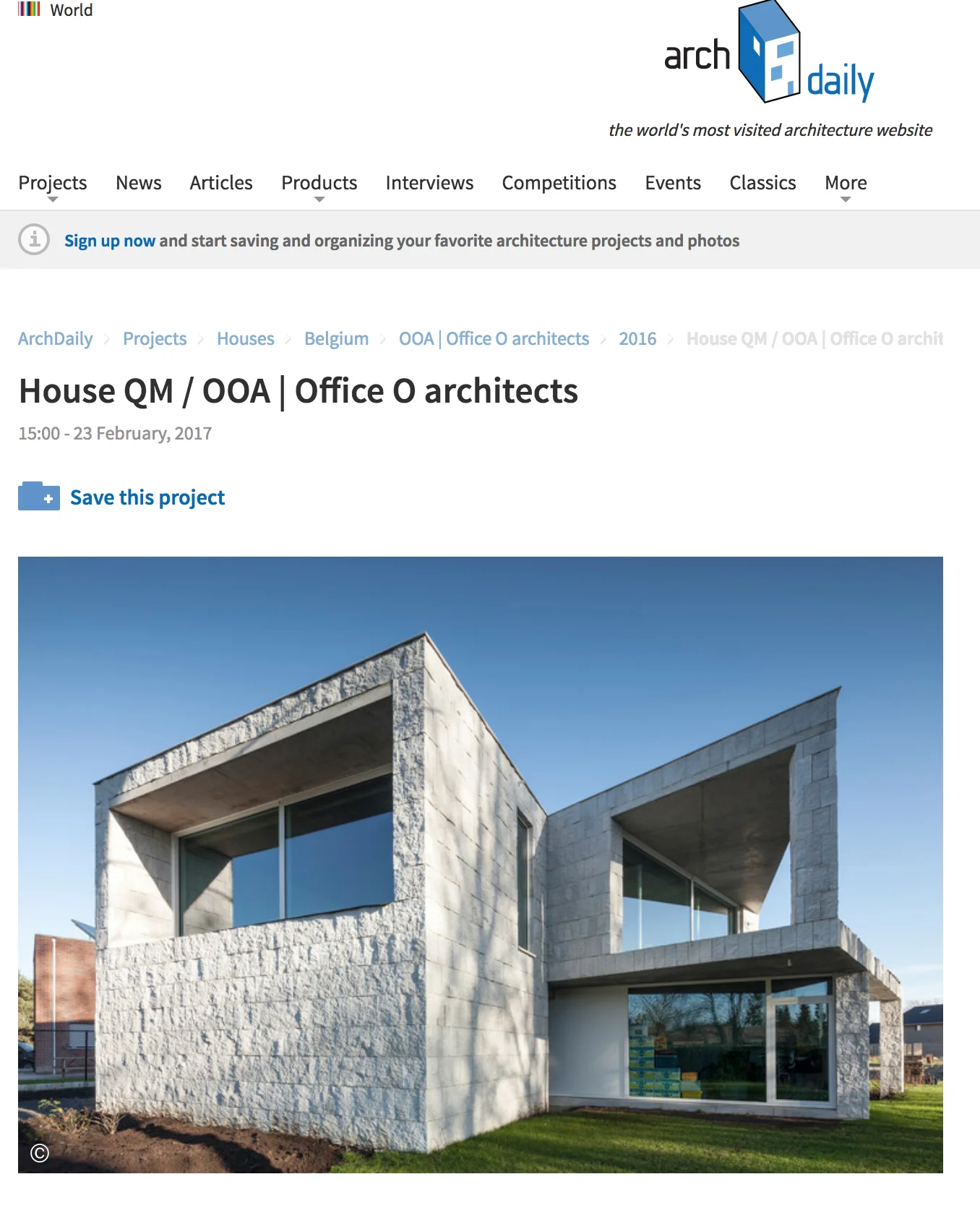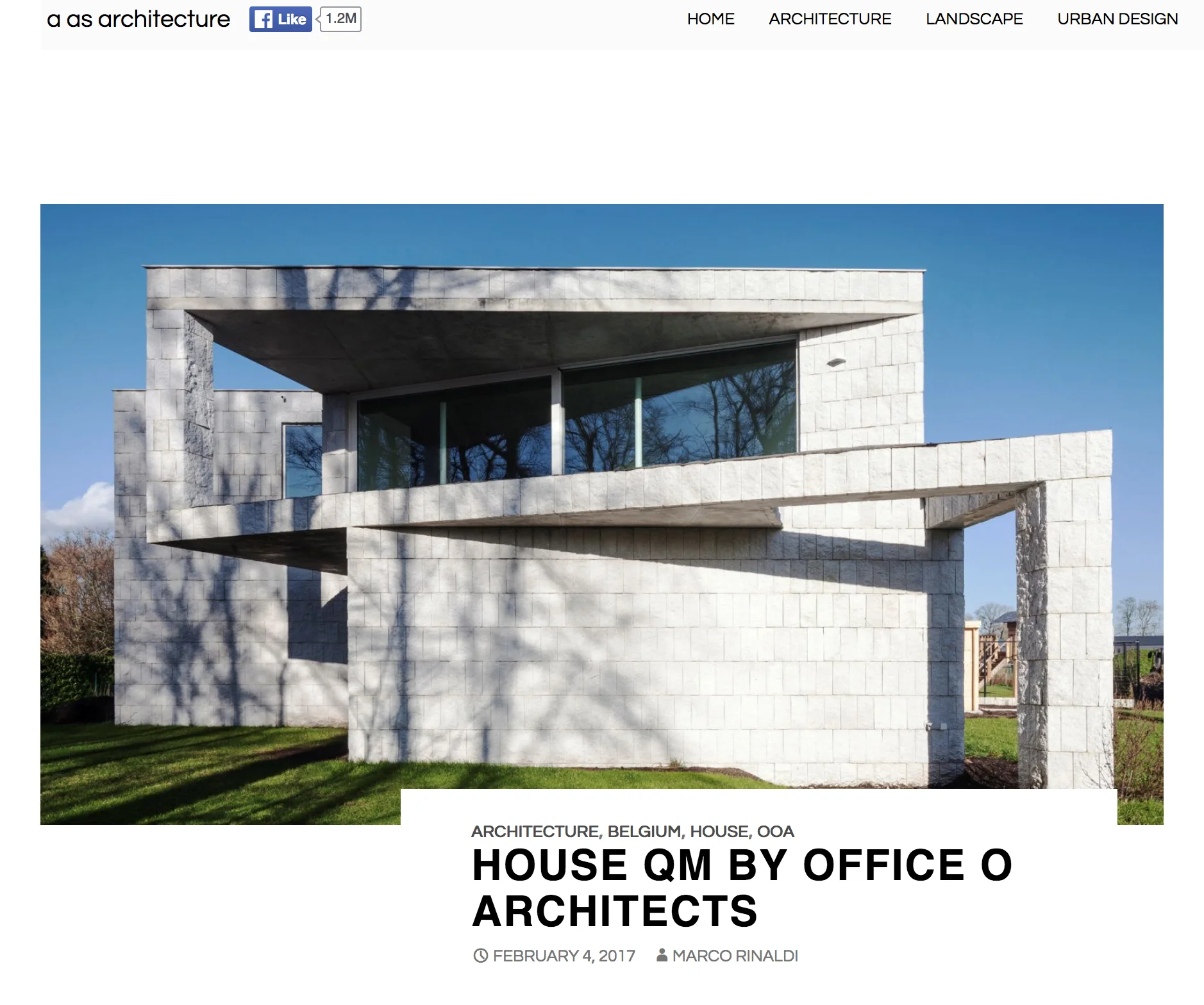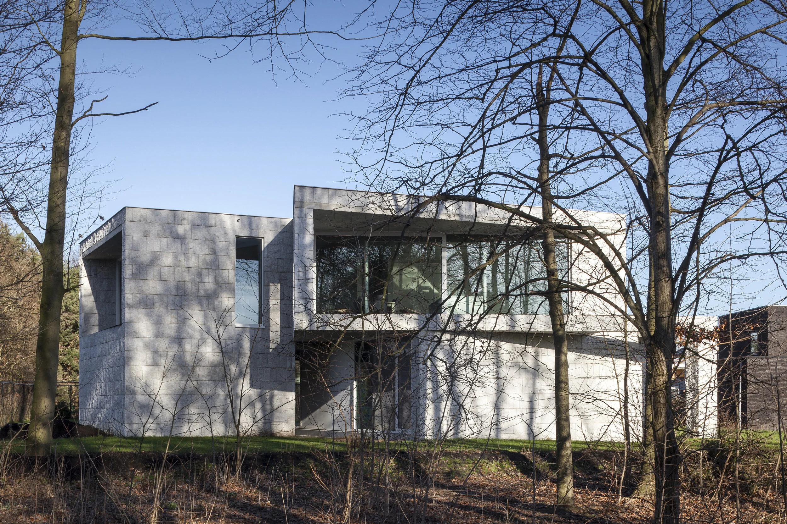 House QM, a family home in Gistel, Belgium, looks like an architecturally realized version of one of MC Escher's paradoxical illustrations. The home has a unique, angular displacement that gives one the impression of a twisted rectangular column — an impression very intentionally fostered by the studio behind the project, Office O Architects.