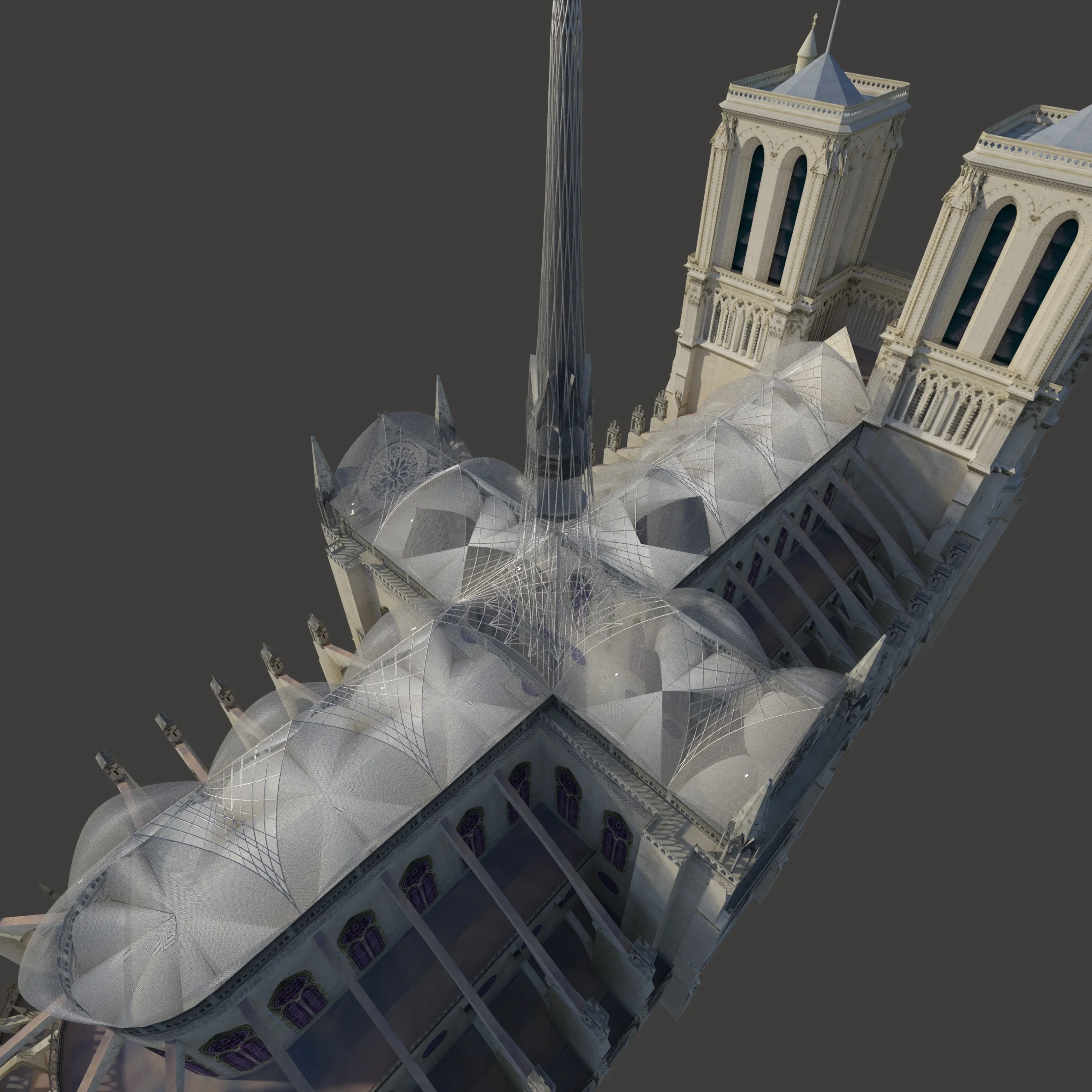 OOA proposes an ultralight structure, consisting of an aluminum frame with EFTE air cushions (translucent / transparent) (the ETFE system is composed of pneumatic cushions retained in aluminum profiles and supported by a light structure). This entirely self-supporting construction of tensioned cables and rods will position the provisional tower (the "arrow") – a three-dimensional representation of the plan of Violet-le-duc - against the Parisian sky again. The air cushions also refer to the original stone vaults concealed under the gable roof. The "arrow" is fixed using cables that stretch and pull it through the roof. The very space that saw the destruction of the stone vault will witness an interaction between the arrow and the interior, bringing forth a hybrid and ephemeral cathedral!
